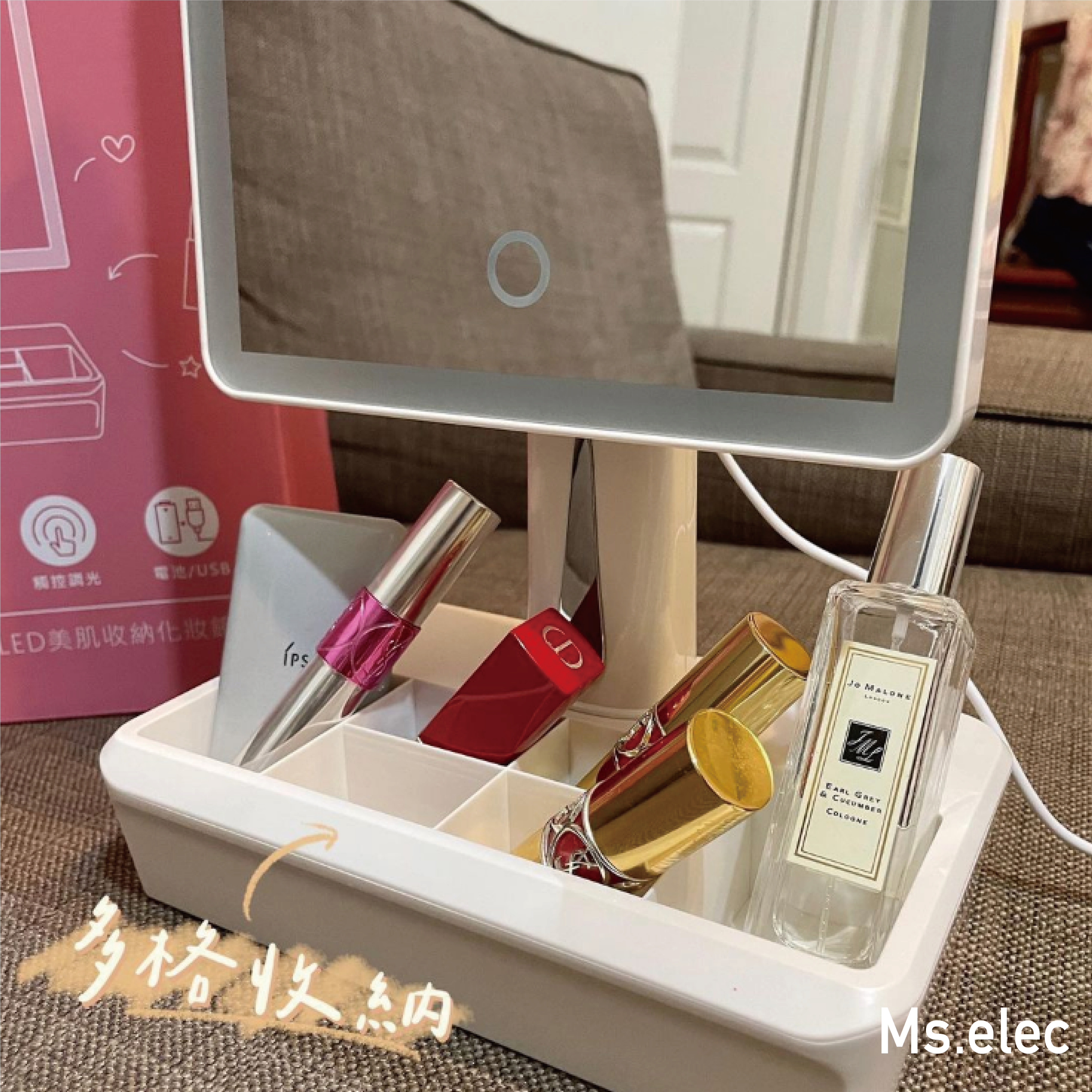 另外,「LED美肌收納化妝鏡」最特別的就是它底座附有多格置物收納功能