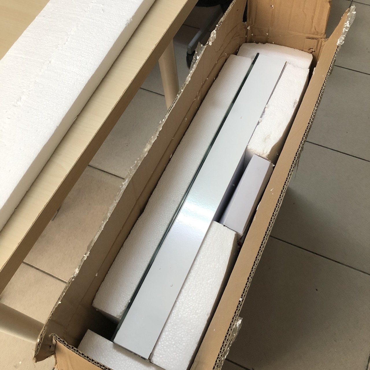 打開箱子後,裡面鏡子的四面八方都是加厚型的保麗龍隔著